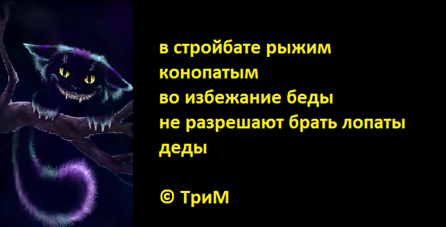 ...ходя не задевать ногами хвосты © Олег Олег Уважайте чужие хвосты, и вам воздастся сторицей! А свой хвост держите пистолетом и берегите от чужих конечностей! )) поймали вражеского скунса вначале нёс какой то бред а поприжали он и выдал секрет © nilyin олег играл шаги за сценой но вскоре понял перерос тогда ушёл учить студентов и мастерство передавать © bombik неразрешимая проблема у буридановой лисы и колобок лежит черствея и сыр © Gena_ вот так захочешь рассердиться возьмёшь сурово за плечо он сверху глядя басом спросит мам чо? © Оксана Лобко в глазах ни тени интеллекта а в тексте был сплошной изюм я так устал от ваших лживых резюм © klarissa как пережить все злоключенья да очень просто вот смотри берёшь и быстро зло меняешь на при © Vlak какое вегетарианство зачахнет кот на овощах смысл в том чтоб убегала пища пища © Олег Олег геронтофил с геронтофилом ведут унылый разговор клянут пластических хирургов грустят что бабки уж не те © Sansonnet тебе я столько переделал за год курсовико