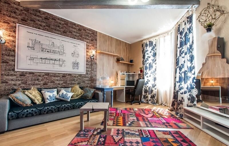 Стоит лишь сделать по новому: положить на пол сразу два ковра. Например, белый пушистый коврик, имитирующий шкуру животного, может быть расположен на нейтральном половике бежевого или коричневого цвета. А ворсистый однотонный ковер яркого оттенка может расположиться на пестром ковре с коротким ворсом. Последнее уместно, если в общем интерьере выбран эклектический стиль.