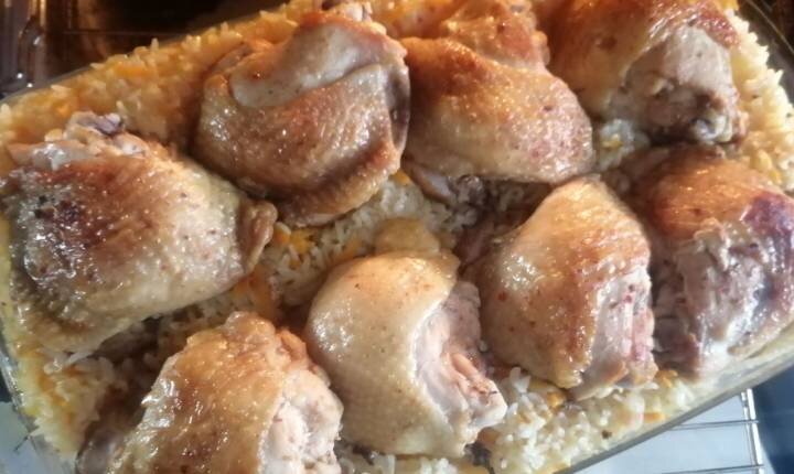 Чтобы накормить всю семью вкусным сытным обедом или ужином, вам не потребуется много усилий. Попробуйте приготовить курочку с рисом по этому рецепту. Нам потребуется: Куриные бедра или голени, посолить и натереть любимыми специями. У меня сладкая паприка и приправа для курицы. Очень вкусно получается с сушеным чесноком. Если есть желание и время можно ненадолго (30-40 минут) замариновать в сметане или майонезе. На большом огне слегка обжариваем курицу на растительном масле до золотистой корочки. Обжариваем не до готовности, доготавливаться будет в духовке. Лук с морковью также обжариваем на растительном масле 5 минут, потом добавляем пару зубчиков чеснока и жарим еще 5 минут. Чеснок лучше мелко порубить, а не пропускать через пресс. Рис промываем под проточной водой, пока вода не станет прозрачной. В промытый рис перекладываем обжаренные морковь с луком, все перемешиваем. Можно добавить приправ для плова. В форму для запекания выкладываем рис. Сверху на рис распределяем курицу. Я готов
