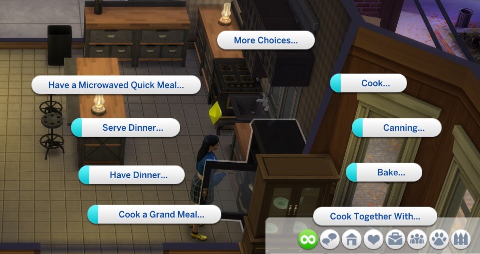 Готовка в the Sims - одна из основных тем, изучив которую можно смело общаться на тему еды и ее приготовления с иностранцами или с людьми, изучающими английский также как и вы. Большее количество конструкций идет в форме повелительного наклонения (Bake... Serve dinner... Cook a Grand meal...) или с глаголом to have. Помимо основных breakfast, lunch, dinner, в игре есть масса функций, используя которые можно наглядно увидеть, что обозначает каждое действие. Думаем, здесь никакого объяснения не нужно. Перейдем к примеру. e.g. My girl is cooking the meat in spices. Нажимая на кнопку "bake" - в Sims открывается несколько видов блюд, которые персонаж может испечь. breadsticks - [breadsticks] - хлебные палочки pre-mixed brownies - [priː-mɪkst ˈbraʊnɪz] - предварительно смешанные брауни sugar cookies - [ˈʃʊgə ˈkʊkɪz] - сахарное печенье bread - [bred] - хлеб cereal marshmallow squares - [ˈsɪərɪəl marsmallow squares] - хлопья "квадратики маршмеллоу" oatmeal cookies - [ˈəʊtmiːl ˈkʊkɪz] - овсяно
