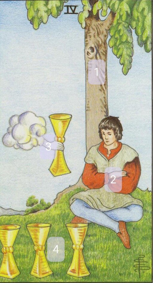 #таро Символика: 1. Дерево - связь с родом/Мироздание/неподвижность, пассивность. 2. Недовольный юноша - человек, который больше не испытывает радости от земных благ. 3. Рука божества с Кубком - неожиданный, но нежеланный шанс/подарок свыше, за который не последует благодарности. 4. Три Кубка на земле - земные удовольствия, в которых больше нет нужды. Человек пресытился ими. Полный образ: Четвёрка Кубков символизирует пресыщение и недовольство тем, что ещё недавно приносило радость. Что показывает Четвёрка Кубков: гадатель разочарован, возможно, оскорблён. Он не хочет больше возвращаться к теме вопроса. Что советует Четвёрка Кубков: если гадатель испытывает обиду и досаду, ему следует временно уединиться. Не стоит возвращаться к ситуации в расстроенных чувствах, иначе можно неправильно воспринять хороший шанс, или вовсе его не заметить. Что обещает Четвёрка Кубков: если гадатель пойдёт по выбранному пути, его ждут досада и разочарование. Если гадатель не хочет отступать, то ему следуе