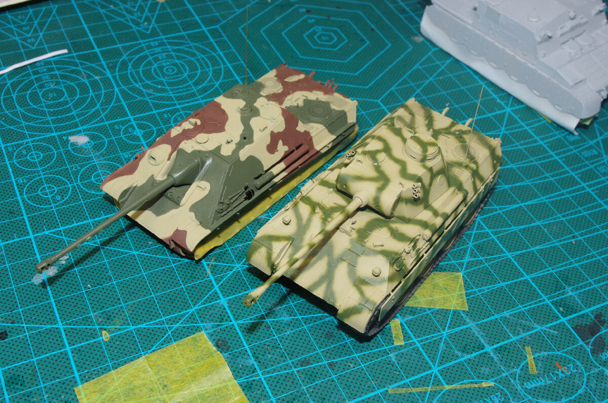 Давно не показывал статус по пантеростроению. Исправляюсь. "Пантера-Д" полностью готова для окраски мелочевки. Сто лет не наносил от руки камуфляж, поэтому выбрал менее рисковый вариант с полосами средней ширины, а не мешанину тонких. На крупных фото видно, что местами вышло не важно, есть мелкие брызги кое-где. Подправлю, плюс фильтр сгладит. Тонкий слой краски на желтой базе приобрел несколько салатовый оттенок. И это спасет коричневый фильтр. Что касаемо формы полос - а их рисовали на глаз, как ляжет факел краскопульта. Так что тоже не так страшно все. На "Ягдпантере" начал красить инструмент. В процессе выяснилось, что ручки щипцов для перерезания колючей проволоки были не деревянные, а из бакелита или какого еще древнего протопластика. Разумно, дерево может отсыреть и превратиться в проводник. В случае заграждения под током даже в эбонит...