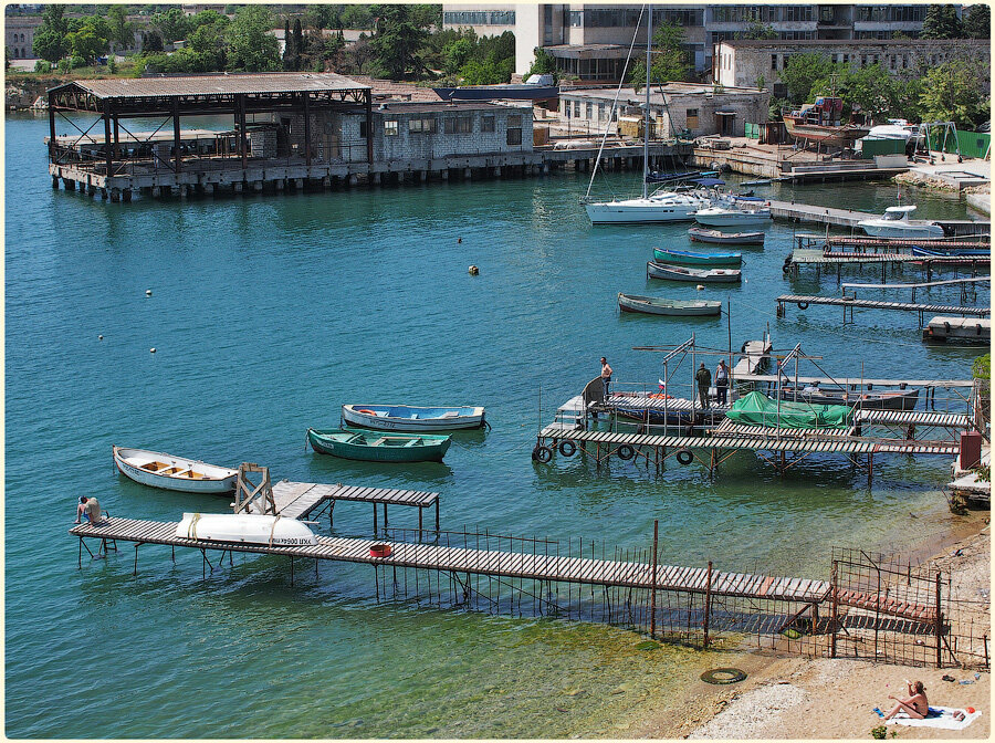 С утра мы от души выспались. И только ближе к обеду выползли наконец из дома в жаркую солнечную действительность. В саду расцветали пышные ароматные пионы — и требовали еды голодные кошки. Мы полили пионы, покормили кошек — и отправились странствовать по Севастополю. Дорогой мимо памятника Солдату и Матросу, через свежепостроенные «стекляшки» мы вышли на Хрусталку. Народ загорал, отдельные дамочки даже купались. Мы почесали в затылках — и дружно решили не таскать с собою мокрые плавки весь день и выкупаться вечером. И пока — пошли мимо катеров, качающихся на разноцветной от дробящихся отражений воде, по набережной к Графской пристани. И уехали катером на Северную сторону. Длинной лестницей мы поднялись на пригорок над морем — к монументу героям-гвардейцам. Практически все памятники, связанные с оборонами Севастополя, расположены на южном берегу Севастопольской бухты. На северной же стороне стоит только один. Зато видно его отовсюду! 9 мая 1944 года воины 2-й гвардейской