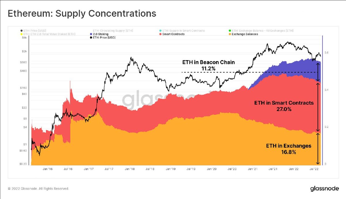 Glassnode: размещение в POS-сети Beacon Chain 11,2% ETH, является сигналом уверенности в успехе слияния со стороны сообщества Ethereum и инвесторов.