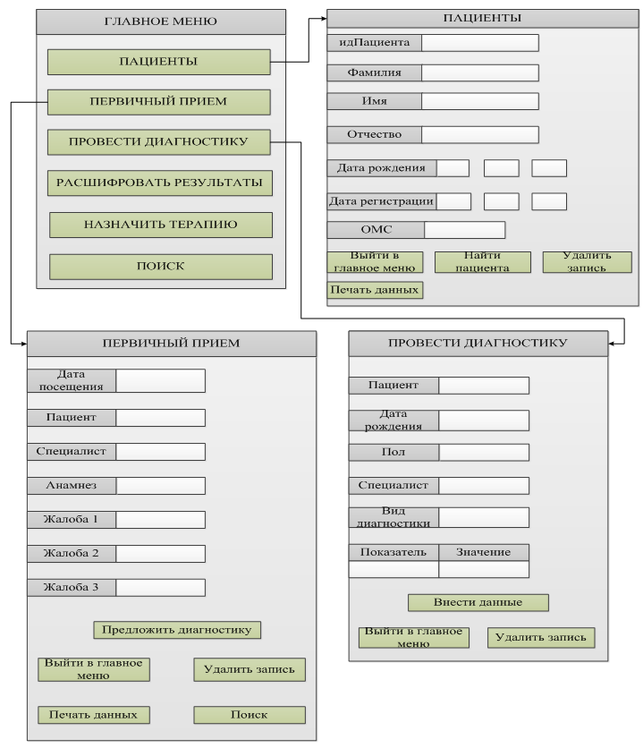 4. Первая итерация - проектирование приложений 4.1 Схема приложения Ссылка на 1-ю часть статьи. Главная задача этапа моделирования экранов пользовательского приложения состоит в формировании наиболее простого для понимания и использования интерфейса, используя который, пользователи не будут сталкиваться с большим количеством препятствий и проблем. В процессе проектирования необходимо принимать во внимание следующие условия: для кого и для чего предназначено разрабатываемое программное обеспечение; как распределяются функции системы по конкретным страницам, и какова их последовательность. На рисунках 4.1-4.2 продемонстрирована схема приложения, отображающая взаимодействие пользовательских форм между собой. Рис. 4.1. Схема приложения (часть 1) Рис. 4.2. Схема приложения (часть 2) 4.2 Структура таблиц баз данных Проектирование базы данных – процесс создания схемы базы данных, а также определение необходимых ограничений целостности. Ключевая стадия проектирования структуры данных состоит в