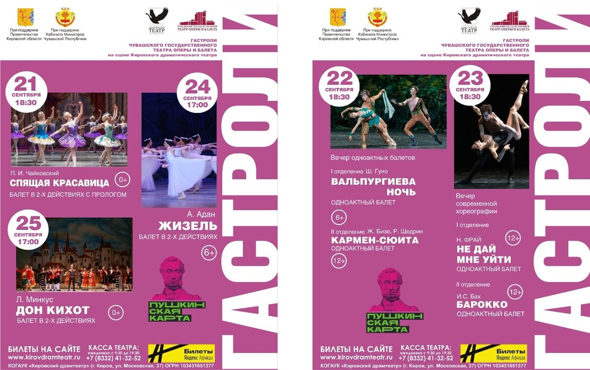 Все балетные постановки в рамках гастролей Чувашского театра оперы и балета, которые пройдут в Кировском драмтеатре с 21 по 25 сентября, доступны к посещению по «Пушкинским картам»!