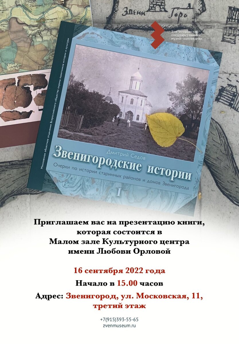 📗Звенигородский музей-заповедник рад пригласить вас на презентацию книги по истории Звенигорода и Звенигородского края «Звенигородские истории», которая состоится в Малом зале Культурного центра имени Любови Орловой. ⏰Дата и время: 16 сентября в 15.00 📌Адрес: Звенигород, улица Московская, д.11, третий этаж