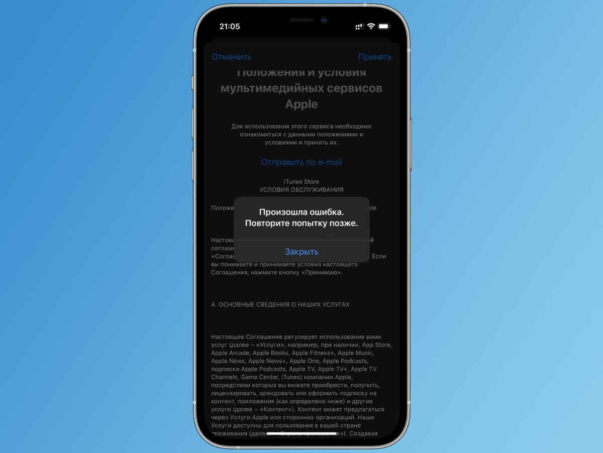 При попытке обновить приложения после установки iOS 16, Apple предлагает принять новые условия App Store. Но при нажатии на кнопку Принять появляется ошибка. Подобные жалобы приходят от пользователей со всего мира. Проблема связана с серверами Apple, которые сейчас перегружены. Вероятно, она будет исправлена в ближайшее время.