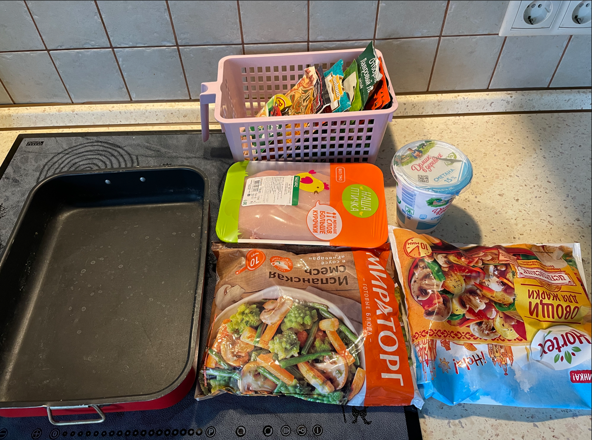 Нам понадобится: Пачка курицы, пара упаковок овощей, пол банки сметаны, специи по вкусу, противень для запекания. Противень смазываем подсолнечным маслом, закидываем в него обе пачки овощей. Курицу мелко рубим, добавляем специй по вкусу. Закидываем сверху на овощи. Берем пол банки сметаны, добавляем воды, чеснок, все перемешиваем до однородной массы и заливаем в противень. Ставим в духовку на 200 градусов, где-то на час. 15 минут возни и ужин готов.