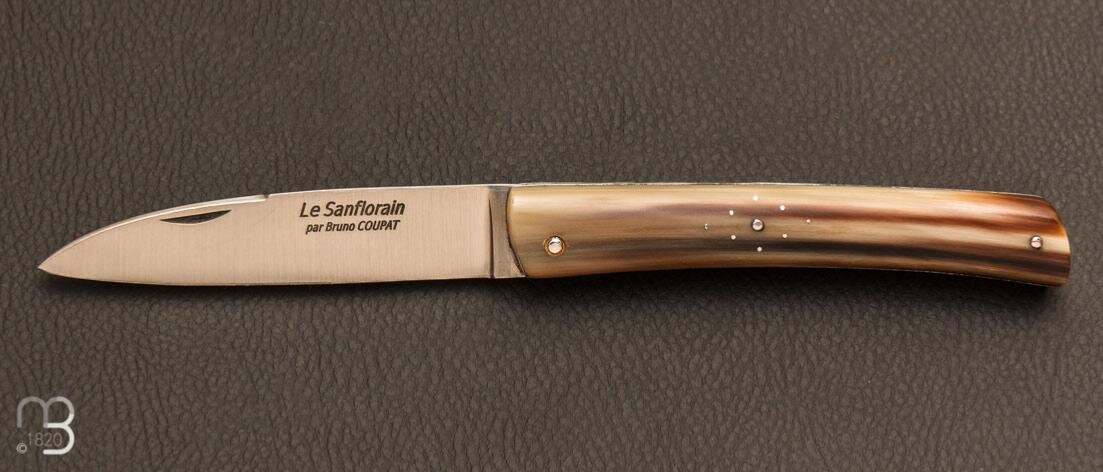 Ножевое производство Брюно Купа находится в Сен-Флуре, предприятие довольно известно в узких кругах и, конечно же, оно хорошо известно любителям региональных ножей. Анри Виаллон, Роберт Бейонне, Дэвид Понсон и другие известные ножевщики Франции сотрудничают с Брюно Купа. Сен-Флур является бывшей столицей Верхней Оверни. В городе находится много популярных достопримечательностей, из которых собор 15-го века и местный музей. А вот своего ножа до недавнего времени не было. Исправить ситуацию взялся Брюно, он сделал несколько набросков на бумаге и связался с Дэвидом Понсоном. Последний охотно взялся за работу и изготовил опытный образец. Совместными усилиями нож был доработан, сегодня Брюно в своем магазинчике предлагает эксклюзивное творение нож - Sanflorain. Этот нож - союз традиции и современности! Sanflorain доступен с лезвием из углеродистой стали XC75 или нержавеющей стали 12C27. Вы можете выбрать его со штопором или без него и с деревянной ручкой (олива, можжевельник, самшит, змеи