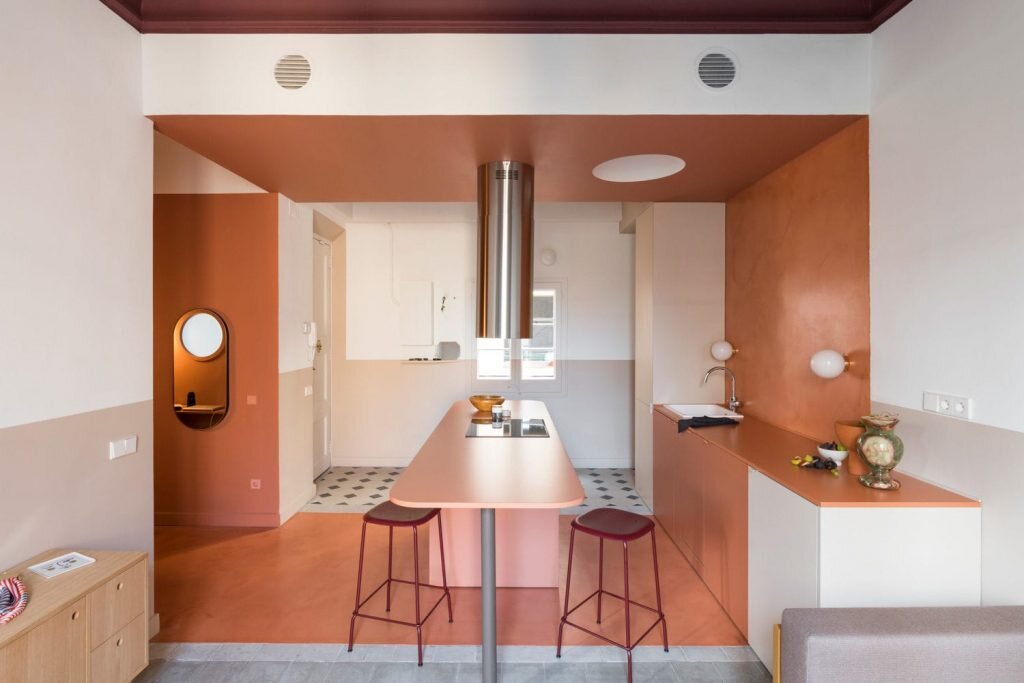 В психологии цвета оранжевый - это цвет радости и творчества, он способствует общему оздоровлению, поэтому он особенно популярен в дизайне офисов и творческих пространств, особенно если мы имеем в виду ярко-оранжевый. Цвет месяца – оранжевая охра – это мягкий оранжевый цвет, очень похожий на терракотовый, что значительно облегчает его использование в домашних интерьерах и во многих других помещениях, как отдельно, так и в сочетании с другими цветами. Вдохновитесь подборкой интерьеров, которые показывают, как украсить оранжевым непредсказуемым и умным способом! 1 Неожиданная оранжевая комната в Париже Эта квартира представляет собой типичную парижскую квартиру османской эпохи с лепниной, паркетом из рыбьей кости и линейным длинным балконом. Вся концепция Toledano + Architects заключалась в создании светового элемента, который позволил бы сохранить все существующие исторические элементы: ответом стала деревянная лента, которая проходит через несущие формованные стены. Весь дизайн монохр