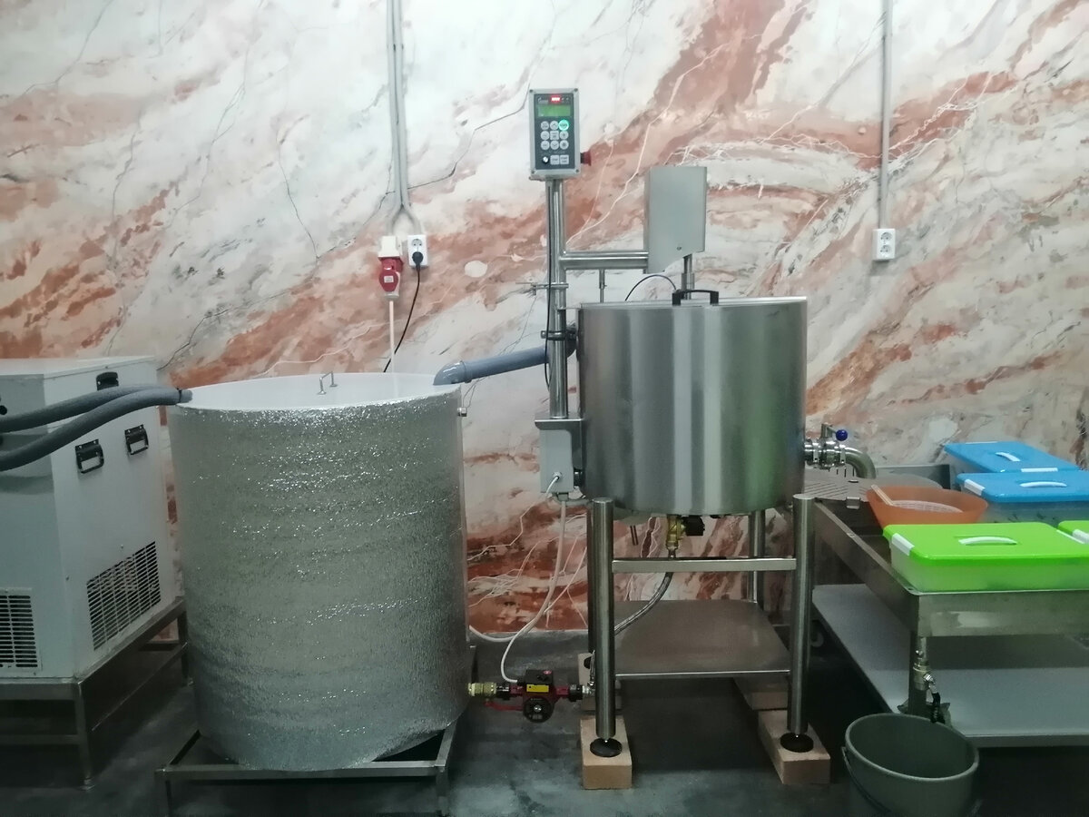 Мы делали теплорасчет, делали расчет энергопотребления при разных режимах работы, и наш вариант устройства охлаждения оказался самым малозатратным. Формула проста, чтобы охладить с 72 до 36 потребуется примерно в 10 раз объема рубашки воды температурой от 6-10 градусов. Поэтому бочка равна 300 литрам, взят объем с запасом и имеет большую инерцию теплообмена. При старте нагрева сыроварне включаем чиллер, который за время нагрева молока заранее охлаждает воду до 6-7 градусов (примерно 20 минут). Стартует охлаждение на этой температуре воды, заканчивает на 20 градусах воды в бочке. Охлаждение 80 литров молока с 72 до 36 градусов занимает 25-27 минут! Итого за один цикл чиллер работает 40 минут, больше не нужен. Отличная экономия и ресурсов агрегата и электроэнергии.