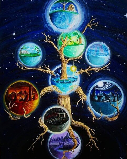 В одной из статей я уже озвучивала, точнее так, написала вскользь про Иггдрасиль - дерево, на котором Один провел 9 дней и 9 ночей. Давайте заострим на нем внимание. Многие из вас скажут, что это не особо-то и нужно, надо руны учить. Я тоже в свое время делала акцент именно на значениях рунических знаков. Но читая массу литературы наталкивалась на некоторые слова и не понимала, о чем они. Лишь много позже я поняла, насколько все это взаимосвязано и познание истории и мифологии помогают осознать некоторые аспекты рун. Итак, Существует 2 версии, что же представляет из себя дерево Иггдрасиль. По одной версии - это ясень, но существует и другая, где говорится, что это тис. Хотя в Старшей Эдде говорится все же о ясене. И это не просто дерево, это своеобразный "образ" мира. Иначе говоря - это Вселенная. На дереве расположено 9 миров: в кроне: ✔Асгард (страна скандинавских богов-асов (Один, Тор, Бальдр, Фригг и др.), мир в котором расположены чертоги Богов и дворец павших воинов - Вальхалла)