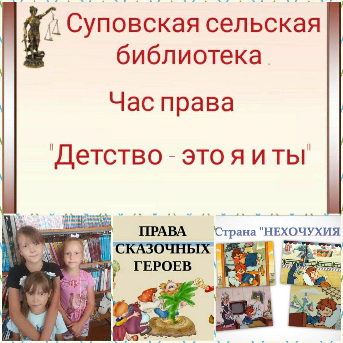 Сегодня в Суповской сельской библиотеке для детей прошёл час права «Детство – это я и ты». Сотрудница библиотеки подготовила презентацию с остальными требованиями, которые прописаны в Конвенции о правах ребенка. Дети узнали, что такое право и обязанности человека и в игровой форме вспомнили о своих правах и обязанностях. Обсудили права школьников, совершили путешествие по стране «Нехочухия». Свои знания проверили и закрепили, отвечая на вопросы викторины «Права сказочных героев». Ребята хорошо справились с заданиями и сделали вывод, что сегодняшнее мероприятие было для них очень полезным и интересным. #culture_tahtamukai #ТМЦБС #суповскаябиблиотека Источник: https://тмцбс.рф/?article_id=90836