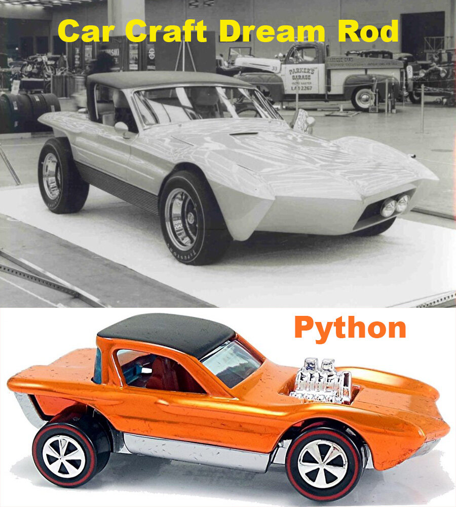 Машинки Hot Wheels, это не только популярные и увлекательные игрушки для детей, но и, зачастую, объекты серьезного коллекционирования. Иногда, в результате этого увлечения, случаются "осложнения". Похоже такое "осложнение" произошло с американским мужчиной по имени Paul Jurewicz (почти как Павел Юрьевич) из городка Ютика штат Мичиган. Вдохновившись моделькой Hot Wheels "Python", он решил сделать ее в натуральную величину. Правда, у модельки существовал реальный прототип Car Craft Dream Rod с кузовом купе, построенный Билом Кашенбери в 1963 году. Так что, возможно, и не было стадии увлечения машинками. Для своего проекта мистер Пол Юревич в 2002 году приобрел Studebaker Golden Hawk 1957 года и начал его безжалостно кромсать. Автомобиль в момент покупки был в плачевном состоянии, так что его не жалко. Было много работы с железом - "болгарка" и сварка не успевали остывать. При постройке использовались кузовные панели от разных автомобилей. Для передка и дверей пошли детали от Pontiac 1960