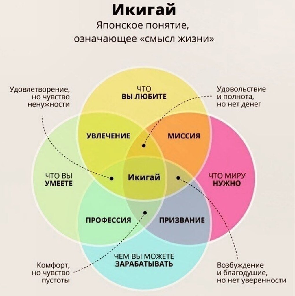 Возрастная психология и общество сообщает, что самоопределяться с профессией человеку положено в старших классах, перед поступлением в ВУЗ или техникум. И эта установка провоцирует возникновение чувства своей ущербности, если тебе 30 или 40, а ты до сих пор не знаешь, кем хочешь стать. Но человек обладает тонкой сложной психической системой, которая не всегда развивается по плану. Сегодня первое образование зачастую не является определяющим, так как многие работают не по специальности или получают новую профессию, а иногда и не одну в течение жизни в поисках своего дела жизни. Икигай – так в Японской культуре называют дело жизни, понятие, которое складывается из четырех форм реализации человека. Есть у этого понятия еще одно определение – это смысл жизни. И лично мне по душе такой подход, он мне очень помог в свое время с самоопределением в профессии. Формула, которая отражает ваше дело жизни: что я люблю делать, что я умею делать, что приносит пользу людям, на чем я могу зарабатывать.