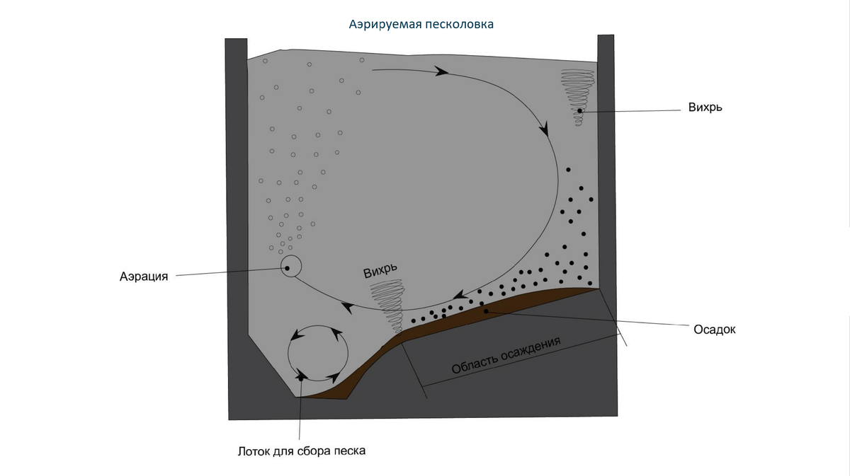 На дне резервуара устанавливаются аэраторы, которые производят пузырьки воздуха. В результате образуется восходящий спиральный поток воды, с помощью которого интенсифицируется процесс разделения нерастворенных минеральных примесей от воды. Такой вид песколовок эффективно использовать при объемах до 10000 м3/сут.