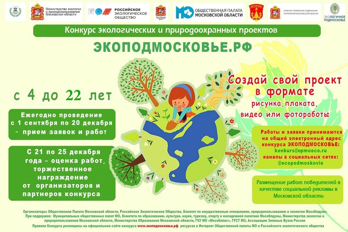📌 Приглашаем всех желающих в возрасте от 4 до 22 лет принять участие в ежегодном конкурсе детских и юношеских экопроектов Московской области «ЭкоПодмосковье-2022». 🖼 К участию принимаются рисунки и плакаты на тему экологии, защиты окружающей среды и природопользования в Московской области, раздельного сбора отходов и их переработки, охраны животных и природных территорий (лесов, водных объектов, воздушного бассейна), новых технологий для защиты окружающей среды. 🎞 Также в конкурсе могут участвовать видеоработы и мини-фильмы на тему защиты окружающей среды и экологических проблем Московской области: «Взгляд на экологию глазами подрастающего поколения», «Экологические проблемы современности и пути их решения», «Защита животных», «Новое поколение о технологиях для защиты окружающей среды». 💬 «Химчане знают, насколько важно заботиться о сохранении окружающей среды. В нашем городе регулярно проходят акции по высадке деревьев и кустарников, уборке берегов водоемов. Действует площадка