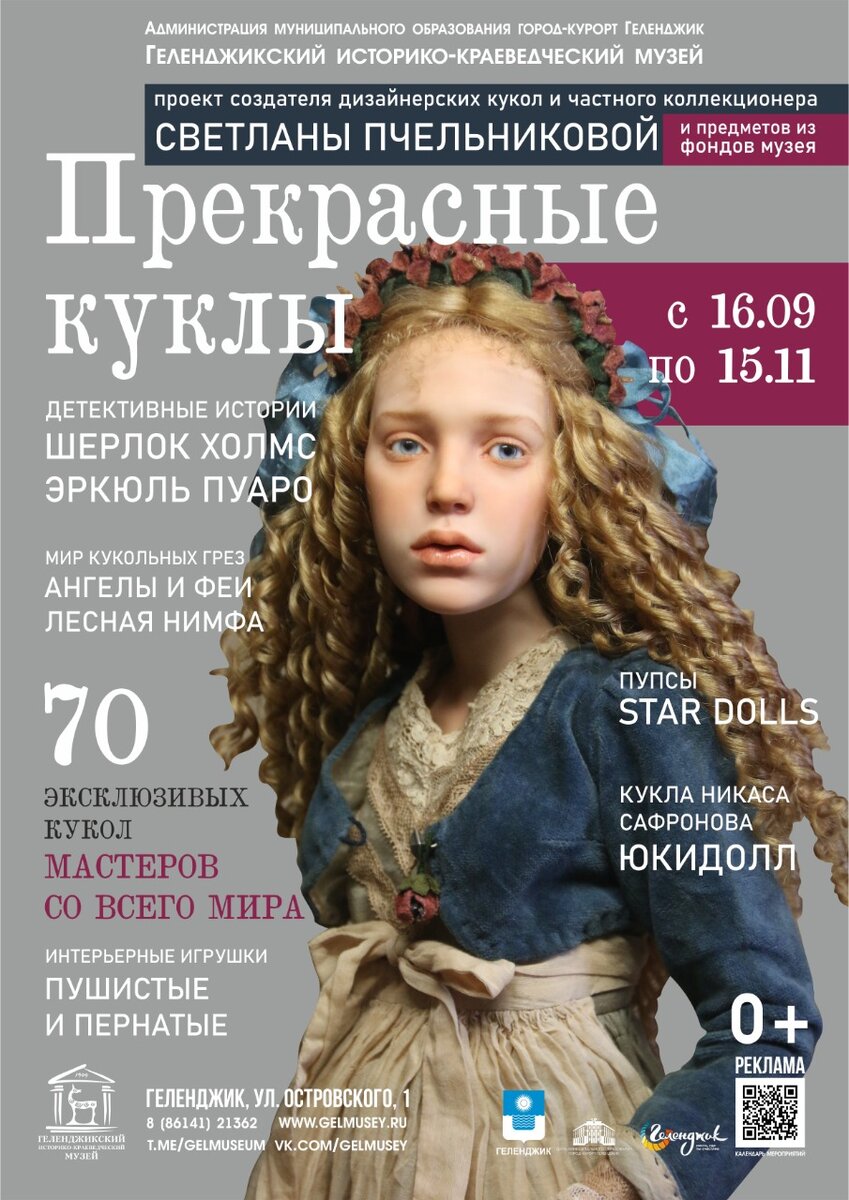 Открытие экспозиции «Прекрасные куклы» состоится 16 сентября, в 15.00. Автор коллекции - Светлана Пчельникова - известный художник, коллекционер, создатель тысячи дизайнерских фигурок из фарфора и полиуретана, организатор крупнейших тематических выставок и благотворительных программ, лауреат Премии Правительства РФ в области культуры. Автор презентует геленджичанам 70 кукол, изготовленных вручную с использованием различных техник и материалов. Создание кукол непростой и кропотливый процесс. Порой одна кукла создается в течение нескольких месяцев или даже лет. На выставке можно будет увидеть эксклюзивных кукол, созданных Светланой Пчельниковой и выдающимися мастерами со всего мира. Самых маленьких посетителей порадуют дизайнерские игрушки в виде самых разных животных. Любителей детективов на выставке ожидает встреча с литературными персонажами Шерлоком Холмсом и Эркюлем Пуаро, почитатели фэнтези смогут увидеть, как выглядят ангелы, лесные нимфы, феи. Всем, кто в душе остался ребен