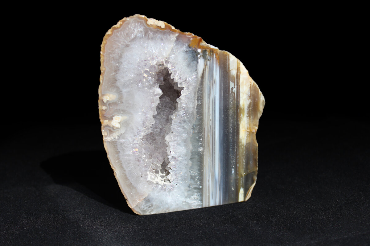 Процесс формирования: Сначала кристаллы растут в газовой полости, оставленной в вулканической андезитовой породе. Затем агат начинает формироваться, покрывая кристаллы и полость внутри. Чем больше агата образуется тем толще покрытие на кристаллах. Этот процесс может продолжаться до тех пор, пока газовая полость не заполнится полностью.
