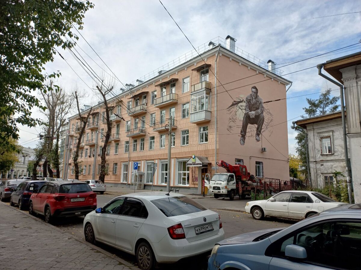 После решили, что поскольку этот дом находится недалеко от музея Валентина Распутина, на торце можно нанести портрет писателя. Его выполнили в технике граффити.
