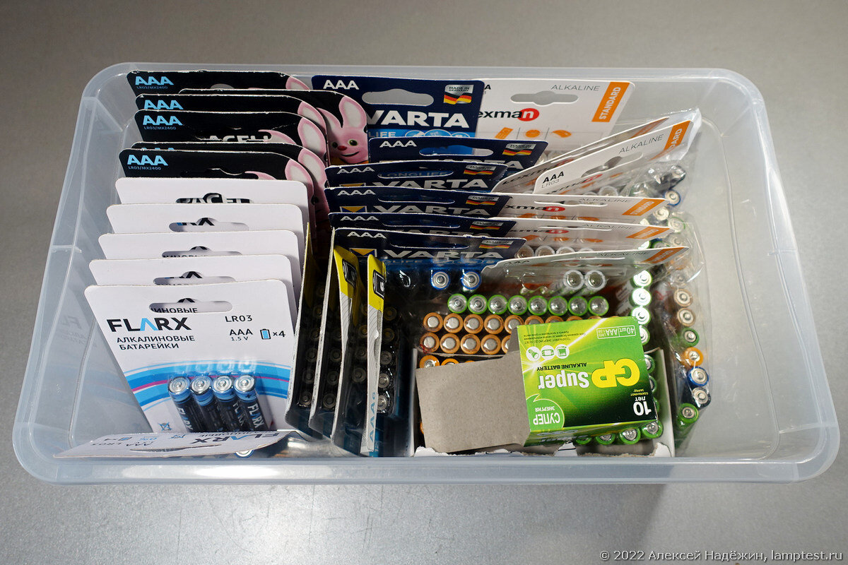 В сентябре 2021 года я купил 192 самые свежие батарейки AAA восьми популярных брендов для того, чтобы посмотреть, как их характеристики будут меняться при длительном хранении. Прошёл год и настало время посмотреть, что изменилось за это время. Очень часто в магазинах можно встретить батарейки, которым уже год, два, а то и три-четыре года. Я затеял этот тест, чтобы узнать, насколько меньше энергии дают батарейки, "пролежавшие" несколько лет. В тесте принимают участие шесть моделей щелочных (alkaline) батареек: самые дорогие бельгийские "Duracell Ultra", американские "Energizer Max +" со сроком хранения 12 лет, немецкие "Varta Longlife Power", популярные и продающиеся везде "GP Super", "Lexman Standard" из Леруа Мерлен и самые дешёвые "FLARX" из Фикспрайса. Кроме того тестируются две модели солевых батареек: самые дешёвые из Ашана и чуть подороже "Трофи". На момент первого теста батарейкам было 5-10 месяцев от даты производства (это самое "свежее", что удалось тогда найти). Одновременно