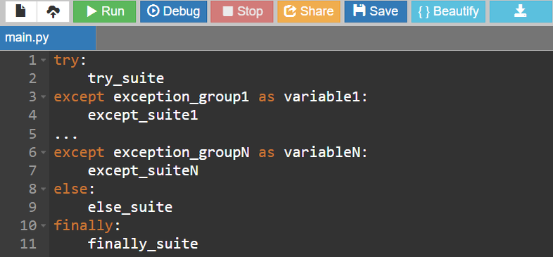 Конструкция try ... except позволяет перехватывать исключения, полный синтаксис выглядит следующим образом: Минимально необходимая конструкция должна состоять из операторов try и except. Все остальные операторы являются необязательными. После оператора try записывается вложенная инструкция того, что должна выполнить программа. В случае успешного выполнения, выполнится инструкция после оператора else, если такой есть в программе. Если присутствует оператор finally, тогда вложенная в него инструкция выполняется всегда и в последнюю очередь. Если во время выполнения инструкции try_suite возникает исключение, то оно проверяется на соответствие операторами except. Exception_group может быть как единственным видом исключений, так и кортежем нескольких. Приставка as variable1 является необязательной и служит для записи исключения в переменную variable1, чтобы затем к нему можно было обратиться в инструкции except_suite1. Инструкция except_suite1 будет выполняться, когда при выполнении try_su