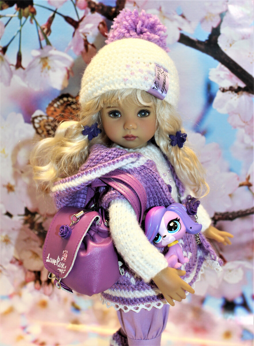 Поиграем в ассоциации. С чем у вас ассоциируется лавандовая роза? С романтикой, барышнями в пышных платьях,... А вот моя ассоциация для Little darling. Совсем не барышня, но такая девочка. Лавандовый кардиган с капюшоном, шапочка с помпоном, свитер, бриджи из хлопка, полосатые носочки и гетры, даже материалы для рюкзака в цвет нашлись и игрушку по цвету подобрали.