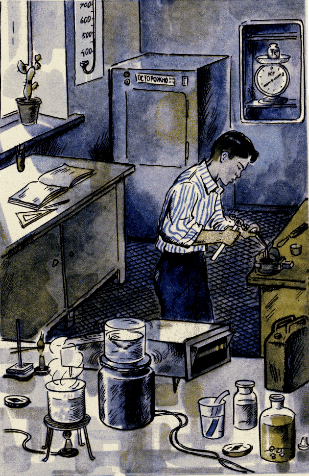 Внимательно рассмотрите рисунок и ответьте на вопросы: 1. К какому примерно часу дня относится рисунок? 2. Нравится ли повару здешний кипяток? 3. Есть ли в лаборатории радиоактивные изотопы? 4. Что находится в кожухе (на столе), на котором стоит сосуд с жидкостью? 5. Какой ток, переменный или постоянный, подведен к лабораторному столу? 6. Есть ли в лаборатории щелочно-земельные элементы? 7. Щелочь или кислота налиты в лабораторный стакан? 8. Какой элемент содержится в веществе, внесенном в горелку? 9. Давно ли занимается слесарным делом лаборант? 10. Куда начал двигаться - вверх или вниз - подъемник с весами? 11. Раствор какого вещества содержится в пузырьке на лабораторном столе? Если вам понравилось, подписывайтесь на канал! Впереди еще много интересного!