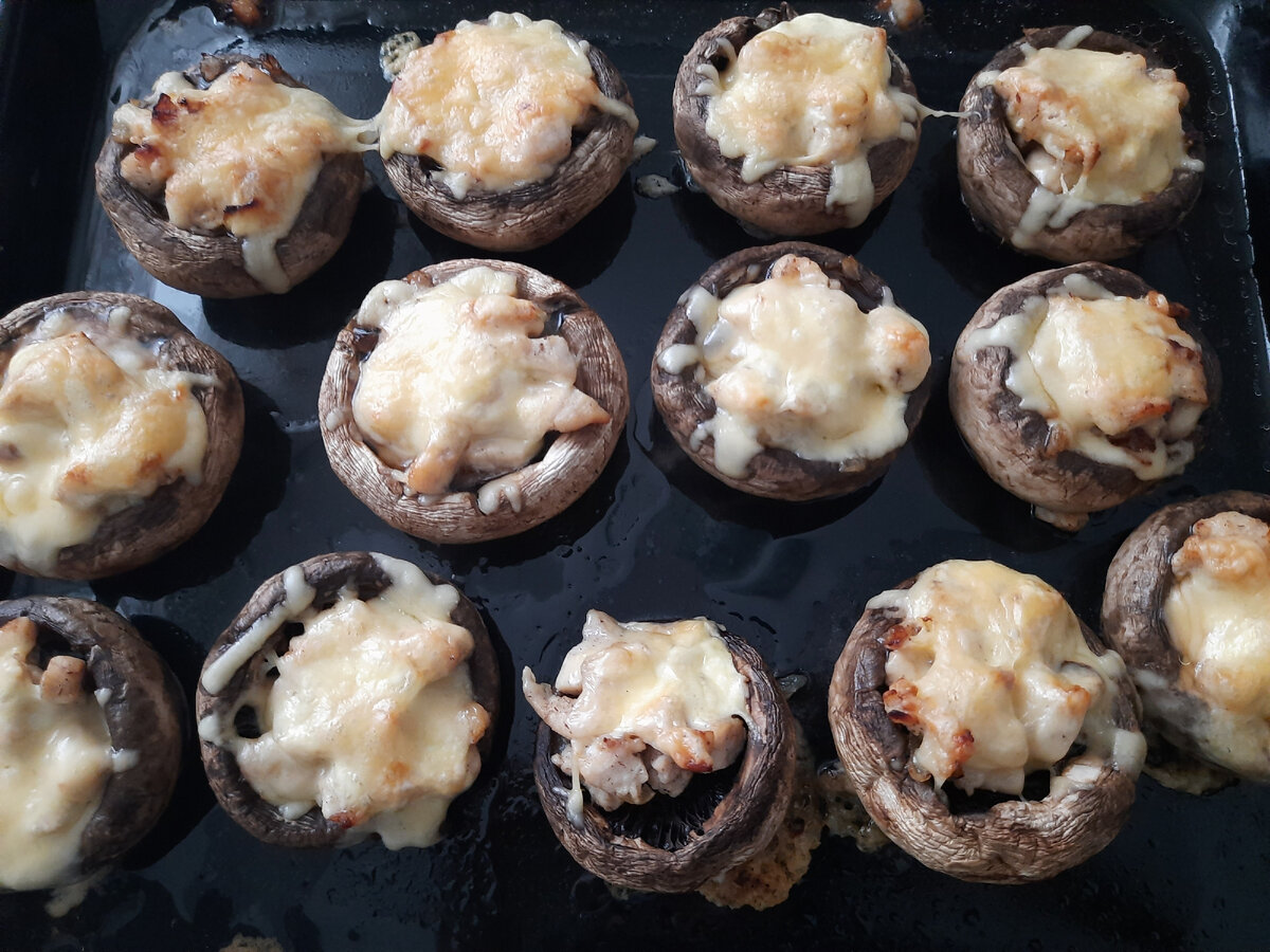 Ингридиенты: Шампиньоны - 500 гр. Сыр твердый - 100 гр. Лук - 1 шт. Куриное филе - 1 шт. Масло растительное - 2 ст. ложки Соль - по вкусу Перец - по вкусу Майонез Способ приготовления: Лук мелко нарезать. Обжарить на растительном масле. Куриное филе также мелко нарезать. Добавить к луку, немного обжарить. Далее посолить и поперчить и обжарить до готовности. Шляпки шампиньонов необходимо отделить от ножек. Вылить на противень оставшееся после жаренья грибов масло и разложить шляпки. (Ножки грибов можно тоже нарезать, обжарить и добавить к куриному филе с луком). Полученной смесью необходимо нафаршировать шляпки грибов. Добавить в каждую шляпку немного майонеза, сыр трем на терке и выкладываем на майонез. Запекать в разогретой до 200 градусов духовке 15-20 минут. Приятного аппетита, это очень вкусно! И пожалуйста подписывайтесь)