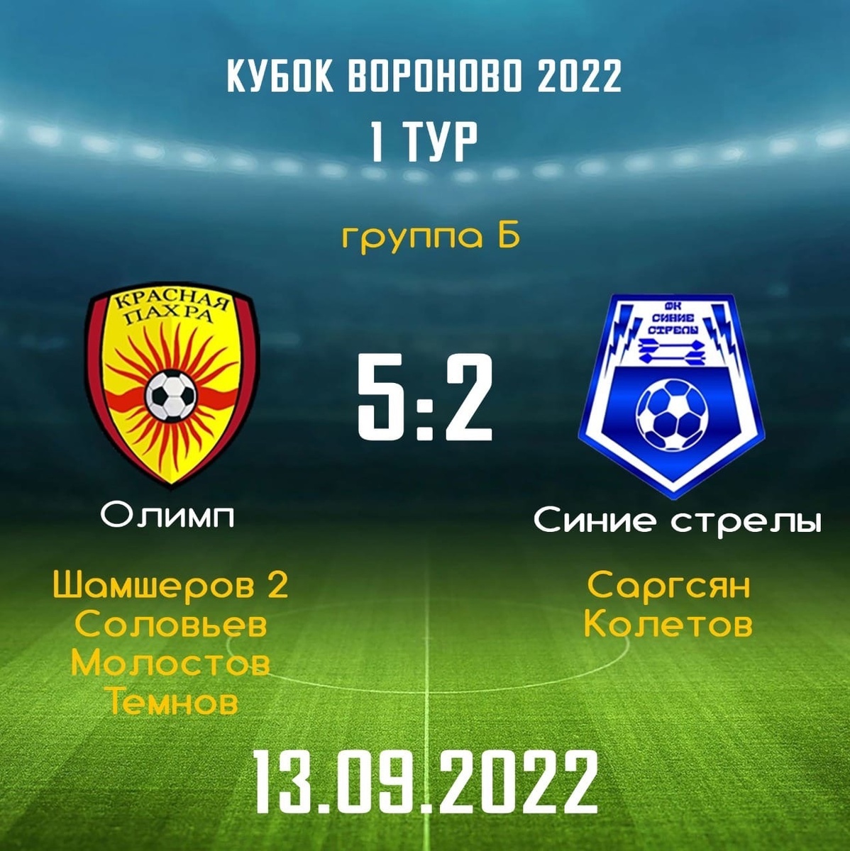 13.09.2022 года в п. Вороновское на территории МБУ "Спортивный комплекс "Вороново" прошёл 1- й тур "Кубка Вороново" по футболу среди мужчин. Несмотря на дождливую погоду, футболисты показали отличную игру и порадовали болельщиков голами. Результаты 1 тура: Кулоб (Вороново) 4-6 Монолит (Рогово) Голы Кулоб: Мухаммад - 3, Сайдалиев - 1 Голы Монолит: Малоземов - 3, Волков - 2, Симащенко - 1. Олимп (Краснопахорское) 5-2 Синие Стрелы (Шишкин лес) Голы Олимп: Шамшеров - 2, Соловьев - 1, Молостов - 1, Темнов - 1. Голы Синие Стрелы: Саргсян - 1, Колетов - 1. Лучшие Бомбардиры турнира (Таблица обновляется) 1. Мухаммад - 3, Малоземов - 3 2. Волков - 2, Шамшеров - 2. 3. Сайдалиев - 1, Симащенко - 1, Соловьев - 1, Молостов - 1, Темнов - 1, Саргсян - 1, Колетов - 1. #футбол #мбусквороново #кубоквороново