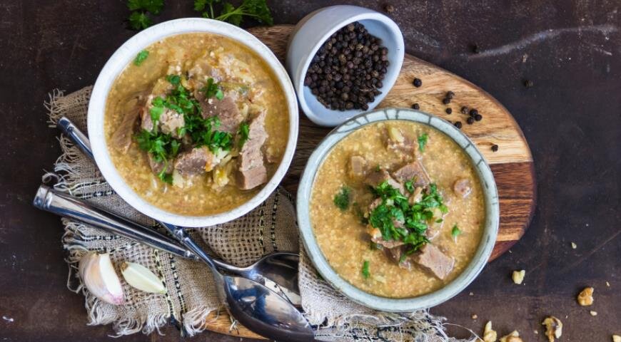 Готовить харчо из говядины в домашних условиях можно и даже нужно! Тем более если у вас под рукой есть хороший проверенный рецепт (такой, как наш!). И, пожалуйста, забудьте всё, что вы знали о харчо до сих пор. Перестаньте спорить, что «правильнее»: говядина или баранина, потому что это блюдо готовят даже из курицы и осетрины. А ещё знайте, что харчо — вовсе не суп, а, скорее, жидковатое рагу. В каждом районе Грузии это блюдо готовят по-своему. Мегрелы не кладут рис, заменяя его грецкими орехами, а имеретинцы могут не использовать орехи, а для густоты ввести кукурузную муку. Тклапи, ткемали, помидоры, специи — все это добавляется в харчо в зависимости от сезона и конкретных предпочтений домохозяек. Пошаговый рецепт