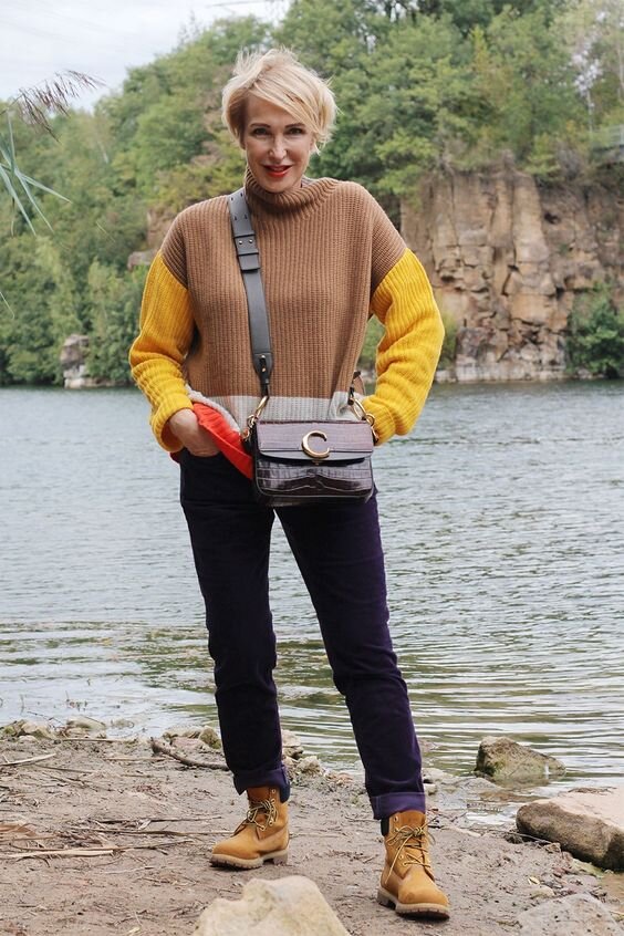 1. Стильный и, безусловно, удобный образ с брюками из микровельвета темно-фиолетового цвета. Модель прямого силуэта, стандартной длины. Но поскольку брюки надеты в комплекте с высокими ботинками, штанины снизу подвернуты так, чтобы образовались стильные отвороты. Ботинки для этого образа подобрали практичные и комфортные, это высокая модель на шнуровке. Верх ансамбля – свободный прямой свитер, связанный трикотажной резинкой в технике колор-блок. Дополнительный элемент – сумка через плечо из экокожи с тиснением.