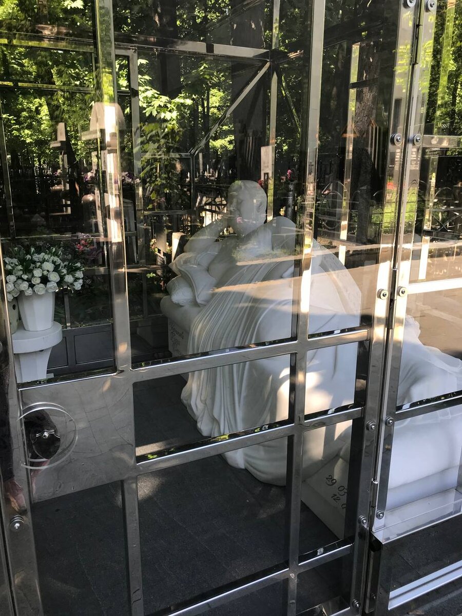Памятник выполнен из белого мрамора, и раньше не был закрыт стеклом. Но, видимо, позже родственники решили защитить надгробие от атмосферных воздействий и воздвигли этот стеклянный колпак.