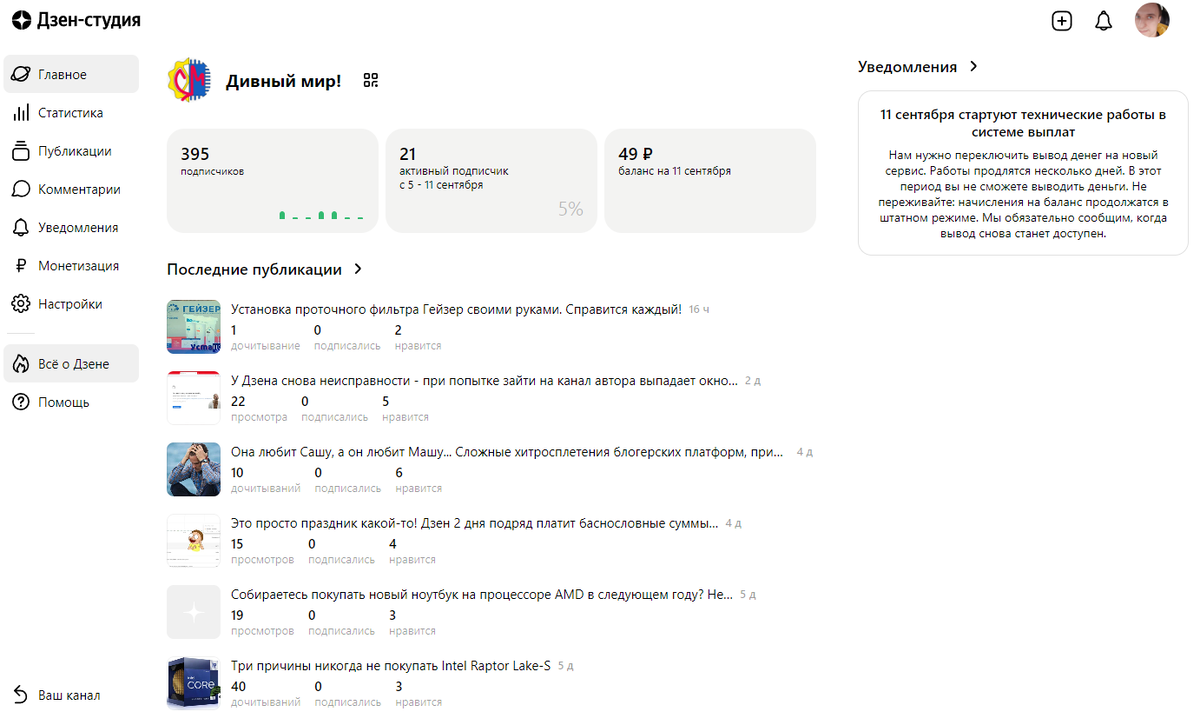 Блок с уведомлениями в правой части студии отнимает драгоценное место, не всегда показывается, и очень надоедливый. Раньше правая часть интерфейса была оправдана – здесь размещались 3 статьи из Журнала Дзен. Сейчас там белая дыра и грустное уведомление.