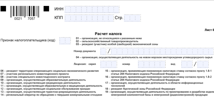 Этот раздел предназначен для расчета налога. Начинается он с проставления признака налогоплательщика, коды с расшифровкой представлены здесь же.