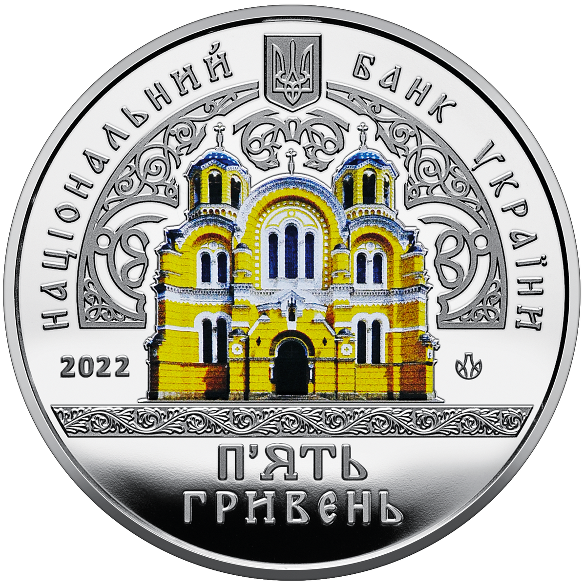 15 июля 1862 года был заложен первый камень будущего Владимирского собора. Строительство храма продолжалось до 1882 года. Причем до 1875 года строительство храма было заброшено, пока в Киев с визитом не приехал император Александр II (1818 - 1881). После его визита строительство храма было продолжено, а в нем приняли участие лучшие архитекторы и художники Империи. Например одним из художников, занимавшихся росписью храма был Виктор Васнецов (1848 - 1926). В 1929 году храм был закрыт. Во время немецкой оккупации храм отреставрировали и после освобождения в 1944 году он стал кафедральным храмом украинского метрополита. Номинал: 5 гривен