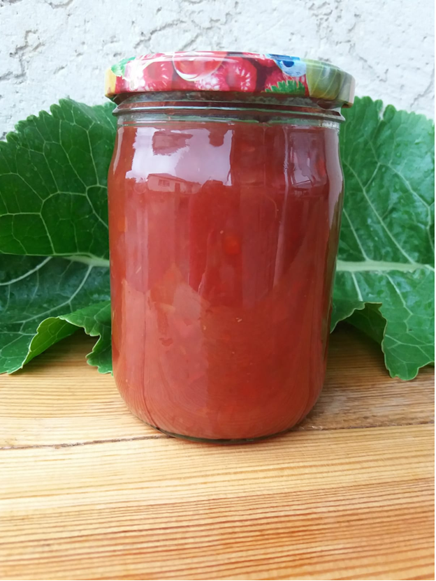 Такой кетчуп я закатываю каждый год по несколько партий. Кетчуп очень быстро съедается моими домашними даже просто с хлебом, кроме того добавив пучок зеленого лука и измельченный зубчик чеснока, получается идеальный соус к шашлыку, мясу. Обжарить лук, фарш потушив с кетчупом получается вкусный соус к спагетти. Перечислять можно много. Этот кетчуп стоит приготовить. Ингредиенты: - помидоры – 2.5 кг.; - перец болгарский красный, мясистый – 2-3 шт.; - лук репчатый – 2 шт.; - сахар – 100 гр.; - соль – 1 чайная ложка; - смесь перцев или черный молотый – 1 чайная ложка; - уксус – 50 мл. 9% или 1 неполная чайная ложка 70%. Помидоры, болгарский перец, лук подготовить и пропустить через мясорубку. Получившуюся смесь перемешать и поставить вывариваться, на медленный огонь около 1.5 часов, периодически помешивая. За 20 минут до готовности добавить молотый перец, соль, сахар. За 2 минуты до готовности добавить уксус перемешать. Кетчуп разложить в стерилизованные банки, закатать крышками, хорошо ук