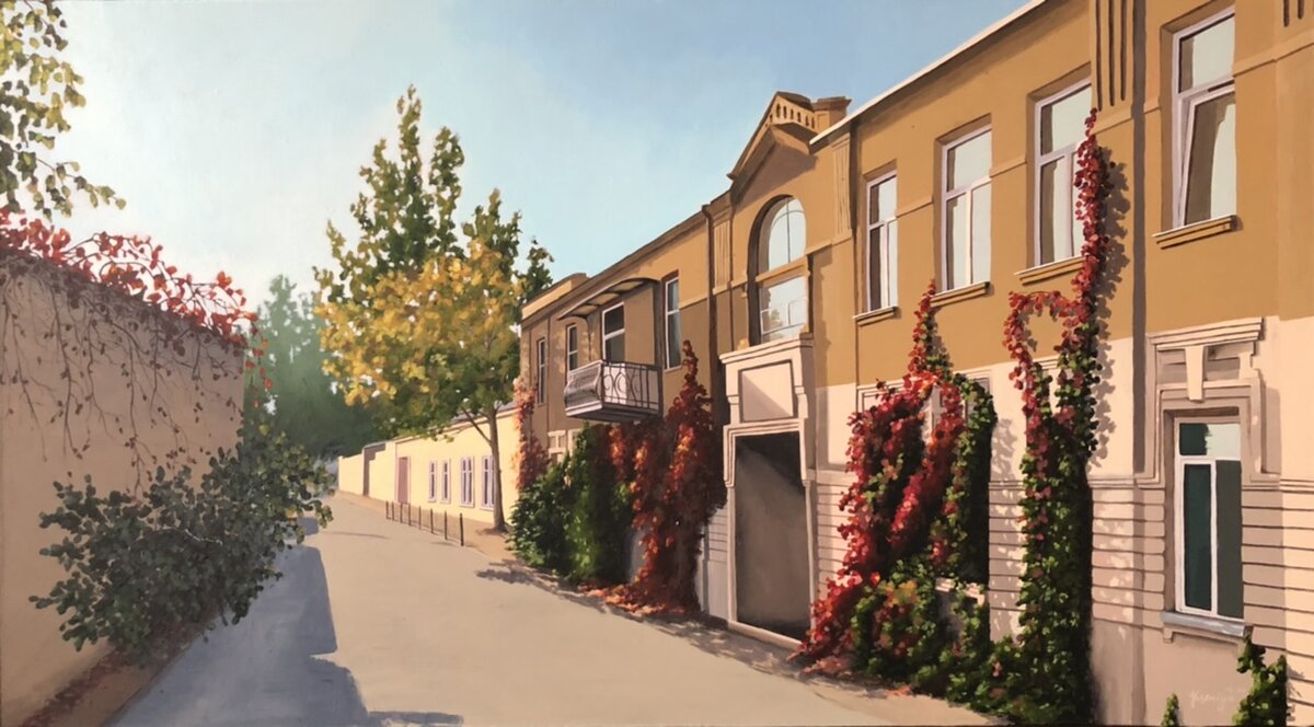 В этой статье я расскажу о том как вижу процесс написания неба и почему чаще всего не изображаю его в первую очередь (это не касается акварели). Цветопередача может отличаться, поэтому я указываю названия цветов. Небо иногда является «фоном», иногда - главным объектом, но я пишу его одним из последних. Это звучит странно - писать фон в последнюю очередь - но это работает в плюс. Сначала все дома, основную «массу» деревьев (листва, стволы, крупные ветки), а потом приступаю к небу. И затем только доходит очередь до деталей (отдельные листья, тонкие ветки). Как видите, здесь также использован грунт, колорированный жжёной сиеной. Акрил не самая укрывистая краска, он весьма прозрачен, и такая «подложка» наполняет небо внутренним тёплым светом. Для получения нужного оттенка я использую белила (титановые - они, в отличие от цинковых, безопасны и обладают большой укрывистостью) и Phthalo Blue от Campus (этот оттенок ещё называют Голубая «ФЦ»). Это весьма интенсивная краска и ее нужно с