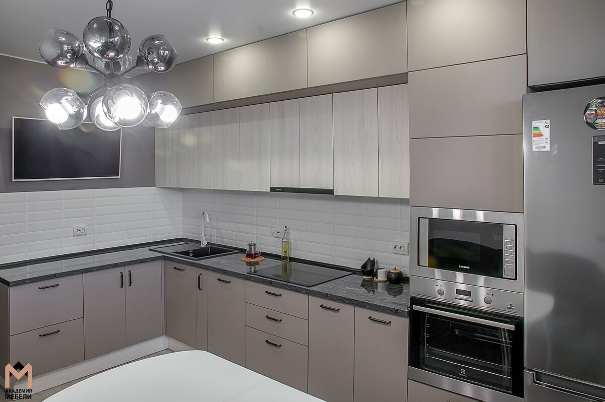 Установили кухню на Карпогорской 12/2 . Кухня в современном стиле - самое популярное решение для квартир и домов. Это объясняется двумя основополагающими для этого стиля характеристиками: эргономикой и элегантностью, именно поэтому кухня в стиле модерн - это выбор прагматичных людей, взгляды которых основываются в первую очередь на практике. Современный стиль подразумевает простоту и функциональность в декоре фасадов кухни. Здесь нет шаблонов и строгих правил. Наоборот, на первый план выступает креатив. Поэтому, определяя цветовое решение данного гарнитура, мы решили сочетать два цвета, две фактуры фасадов: уютный и тёплый «Ясень Ривьера» и строгий «Силк Анис». Это сочетание создало ту самую атмосферу сдержанности и элегантности, к которой стремятся практичные и успешные люди. Хозяйки, у которых много габаритной посуды и бытовой техники , особенно ценят такое планировочное решение. Верхние модули решено было делать без ручек , чтобы визуально не утяжелять конструкцию и сохранить атмос