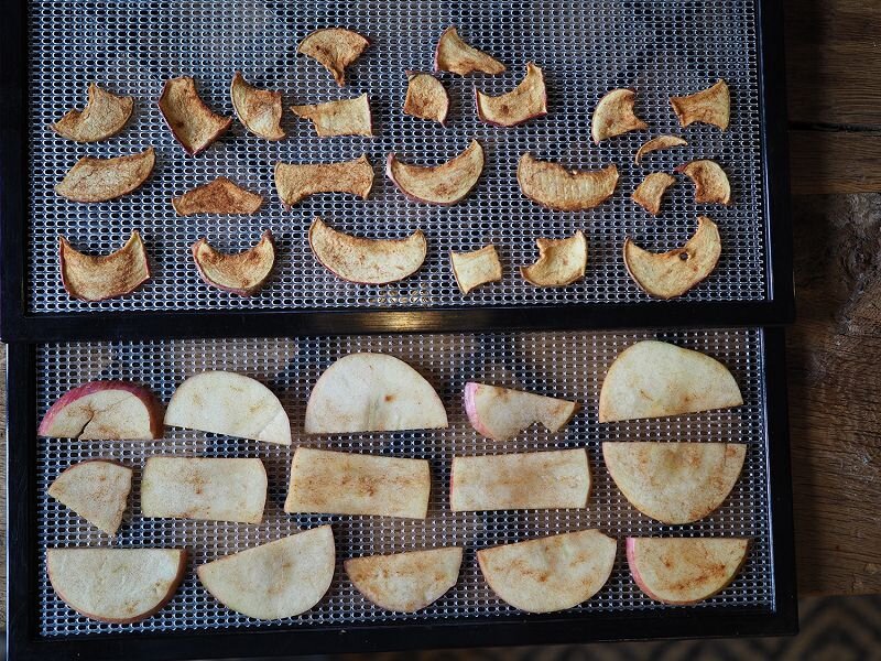 Еда сильно сжимается, когда теряет влагу, так что помните об этом, когда будете рассчитывать объем порций. Например, полкило яблок (до нарезания на дольки) превращается в чашку сушеных яблочных долек. Хотя тонко нарезанные ломтики позволяют равномерно высушить продукт, не нарезайте пищу на слишком мелкие куски, иначе они потеряются в процессе восстановления.