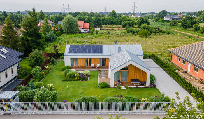 Варшавская студии Z3Z ARCHITEKCI спроектировала дом, руководствуясь принципу американского архитектора эпохи модернизма Луи Генри Салливана — «форма следует за функцией». Как пишет archinea. pl, в этом здании, состоящем из двух частей, можно увидеть четкое разделение функций внутри дома. Здание представляет собой одноэтажный одноквартирный жилой дом с гаражом на две машины. Его форма состоит из двух блоков, покрытых двускатной крышей, создающих читабельную композицию — они одинаковой высоты и ширины, отличается только длина. Подробнее