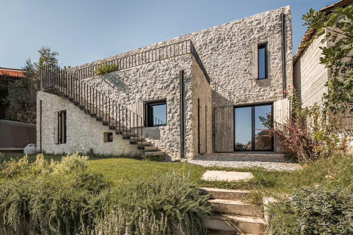 Участок, расположенный в отдаленной, обычной деревне Каламия, в окружении оливковых рощ и беспрепятственного вида на Коринфский залив, представляет собой место для уединения от шумной городской жизни, где живёт молодая пара, любящая природу, с тремя детьми. Морфология места — склон с перепадом высоты 6 м от вершины до низа, привела к решению создать дом со скромной, каменной «конюшней», которая незаметно вписывается в окрестности, развиваясь в двухуровневую конструкция со стороны сада. Было проведено тщательное исследование контекста и материальности с целью современно включить жилье в окружающую среду. Отправной точкой творческого осмысления стало индустриальное ощущение традиционной каменной конюшни, характерной для сельской местности Пелопоннеса с её низкой, длинной и черепичной крышей. Входной уровень обустроен пандусом и представляет собой общее пространство жилища. Он связан через большие проёмы с открытой смотровой площадкой, подходящей для наблюдения за звездами и морем вдали
