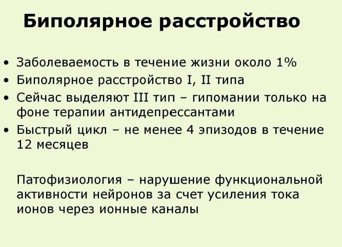 Биполярное расстройство 1 типа - представляет собой эпизодическое расстройство настроения ,определяемое возникновением одного или нескольких маниакальных , гипоманиакальных или смешанных эпизодов. Хотя диагноз можно быть поставлен на основании данных об одном маниакальном ,гипоманиакальном или смешанном эпизоде. Обычно в течении расстройства,маниакальные , гипоманиакальные и смешанные эпизоды чередуются с депрессивными эпизодами.