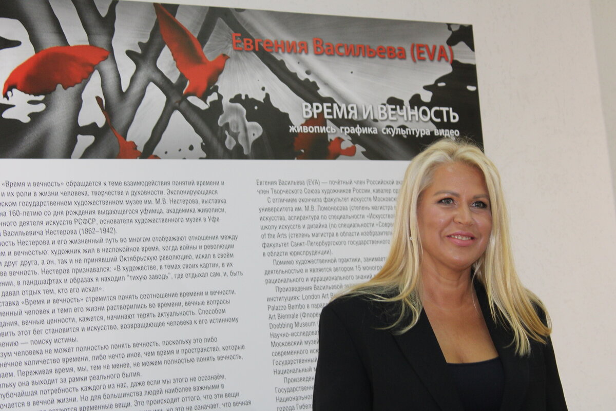 Прекрасный сентябрьский день, настолько теплый и ласковый, с синим-пресиним небом. На улице и на душе практически май. Я с лёгкостью иду по улице 13 сентября на выставку Евгении Васильевой «Время и вечность» в музей Нестерова. Хочу сохранить в себе незамутнённое восприятие ребенка. Встречаю стайку студентов института искусств, любуюсь их яркостью. Поднявшись в выставочные залы, обнаруживаю, что почти все уфимские культурные герои собрались на этом открытии. Здороваюсь с художником Бузыкаевым и журналистом Шамилем Валеевым, обнимаюсь с Яниной Свице из музея Альбанова. Слушаю речь министра Амины Шафиковой и муфтия Талгата Таджуддина. Но надо же не только медийными лицами любоваться, но и экспонаты разглядеть - синтез фотографии и мазков акрила, скульптуры и видео транслирующееся на экранах мониторов. Думаю об Энди Уорхолле. Снилось ли ему такое, когда он создавал свои композиции из этикеток банок с томатным соком. Иду по четырем залам музея, экспонатов выше сотни, в одном из залов арт-по