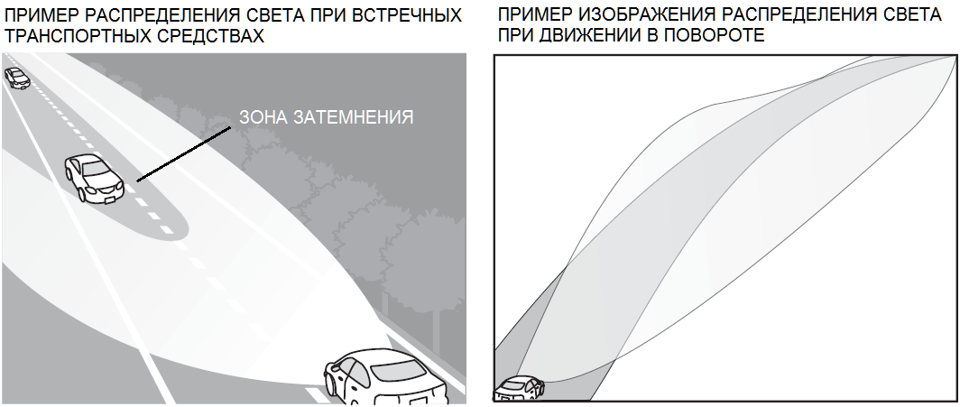 Адаптивные светодиодные фары улучшают видимость дороги за счет увеличения диапазона освещения, исходя из условий движения автомобиля без переключения фар между дальним и ближним светом (HI / LO). В зависимости от приближающихся транспортных средств встречного направления, транспортных средств, движущихся в попутном направлении впереди, а также скорости движения самого автомобиля, в том числе в повороте, его фары автоматически увеличивают или уменьшают свою яркость.