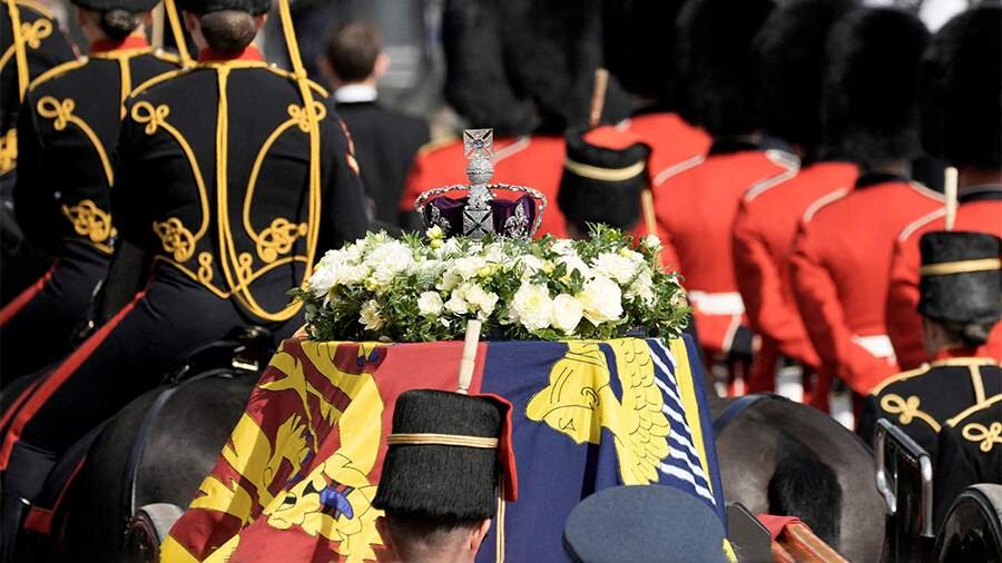 Похоронный кортеж с гробом королевы Великобритании Елизаветы II покинул 14 сентября Букингемский дворец и направился к зданию парламента (Вестминстерский дворец), где пройдет публичное прощание с монархом. Об этом пишет Sky News. Шествие началось в 14:22 (16:22 мск) и продлилось 38 минут. Траурную процессию сопровождали король Карл III, его сыновья принц Уэльский Уильям и герцог Гарри, а также другие члены королевской семьи. Гроб с телом Елизаветы II был доставлен в Букингемский дворец накануне, 13 сентября. Вдоль улиц выстроились толпы людей, чтобы посмотреть, как гроб с телом монарха завершил путь из Эдинбурга в Букингемский дворец. На ночь гроб остался в комнате, где когда-то Елизавета II встречалась с футболистами Премьер-лиги и обедала с иностранными королевскими особами. В Лондон гроб с телом британской королевы был доставлен из Эдинбурга военным самолетом. Тело Елизаветы II будет выставлено в одном из залов резиденции монарха, где с ней смогут проститься придворные и персонал дв