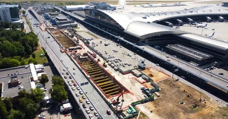 Сообщается, что сама станция сейчас готова на 45%, идет монтаж основных конструкций, прокладка коммуникаций и строительство выходов в терминал аэропорта и к платформе аэроэкспресса. Отдельно строительство участка осложняется тем, что через речку Ликова приходится возводить новый метромост длиной 460 м.