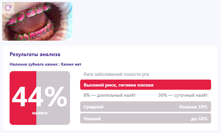 После окрашивания зубов и создания отчета DIANA приводит следующие результаты: гигиена полости рта неудовлетворительная, присутствует высокий риск развития заболеваний. Налет покрывает 44% поверхности зубов, из которых 36% составляет суточный. Более 2/3 поверхности коронки покрыты свежим налетом. Такая ситуация в полости рта – не редкость. Особенно это касается пациентов, носящих брекеты. Часто они сталкиваются с трудностями в очищении, которые приводят к накоплению налета на поверхности зубов. Эта ситуация опасна не только риском развития кариеса и его осложнений, но и затруднением всего ортодонтического лечения. При неудовлетворительной гигиене полости рта врач-ортодонт может прийти к решению о снятии брекетов, из-за чего в исправлении прикуса придется взять долгую паузу. Чтобы избежать подобного, необходимо мотивировать пациента на уход за полостью рта. DIANA позволяет врачу вести историю наблюдений и корректировать его навыки, а также назначать дополнительные средства гигиены для