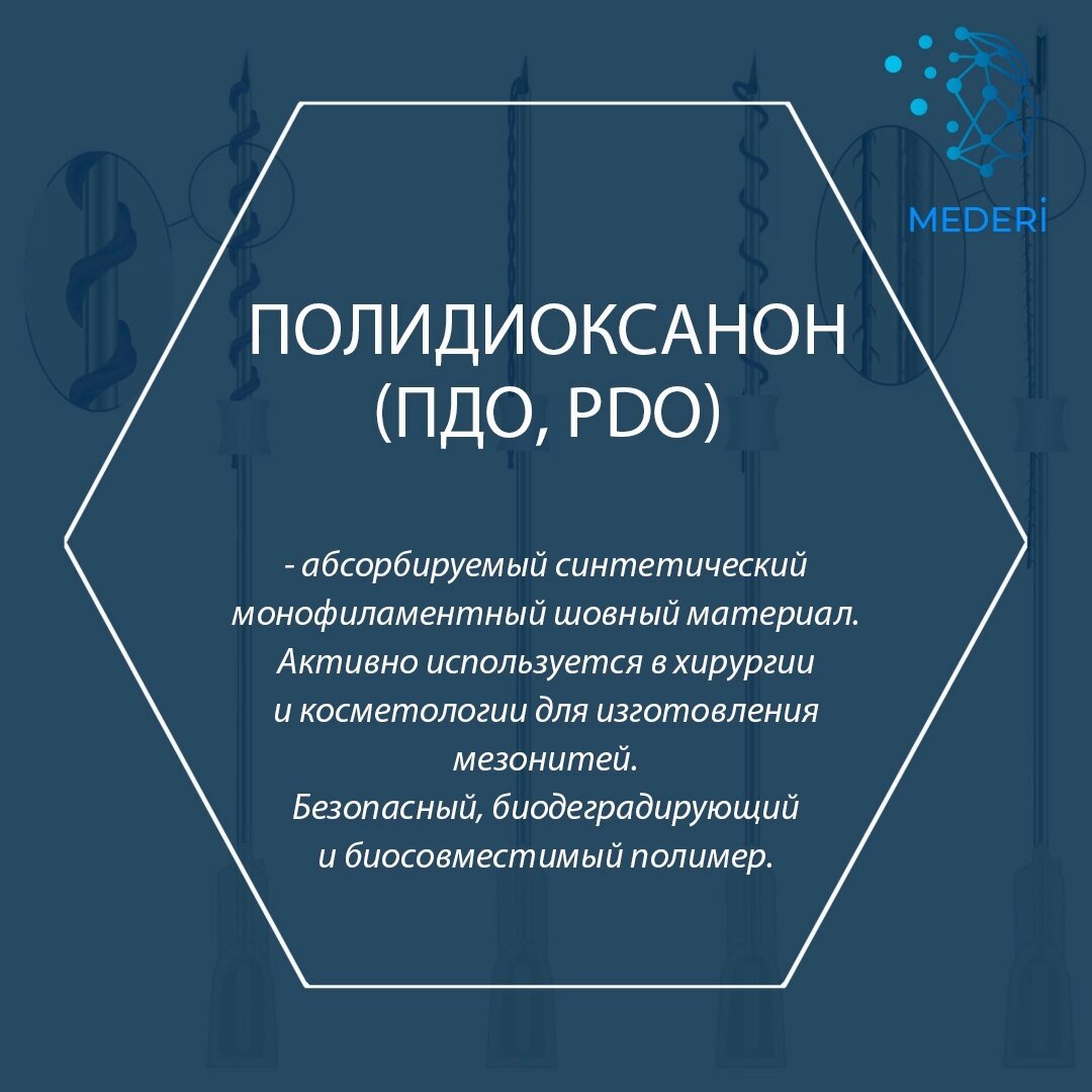 PDO известны в медицине с 1980-х годов как рассасывающиеся хирургические нити. Однако в последнее время они активно используются в эстетической медицине и занимают одно из первых мест в ряду современных омолаживающих технологий. ПДО-нити решают проблемы морщин и ярко выраженных складок, а также обвисания кожи лица и тела в результате возрастных, травматических и других изменений. Нить ПДО обладает высокой биологической инертностью и атравматическим прохождением сквозь ткани, прочна, эластична, гидрофобна, некапиллярна и нефитильна. Полидиоксанон лишен антигенных или апирогенных свойств и в процессе рассасывания вызывает лишь легкую тканевую реакцию. Механизм рассасывания: прогрессивная потеря прочности на растяжение и абсорбция обусловлена тем, что в процессе гидролиза полимера происходит образование мономеров 2-гидроксиэтоксиуксусной кислоты в дальнейшем абсорбируемых и разрушаемых организмом. Сроки рассасывания: через 14 дней шовный материал полидиоксанон сохраняет около 75% своей пе